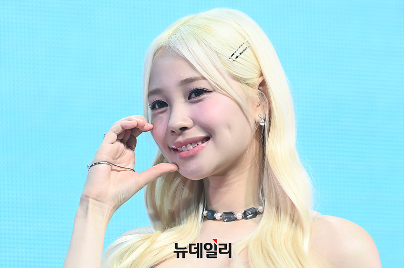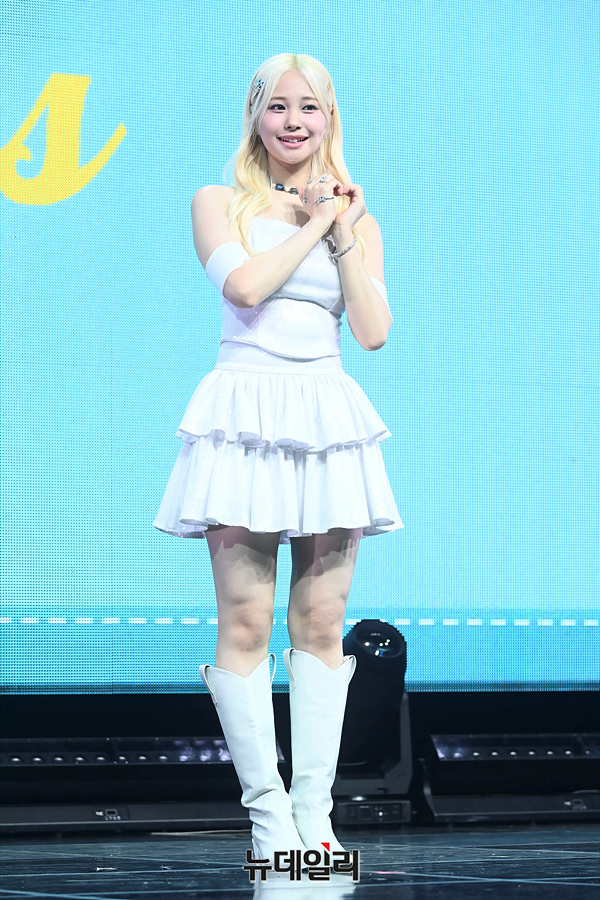 걸그룹 위클리 지한이 9일 오후 서울 마포구 신한 SOL 페이 스퀘어에서 열린 미니6집 '블리스(Bliss)' 발매 기념 쇼케이스에서 포즈를 취하고 있다.