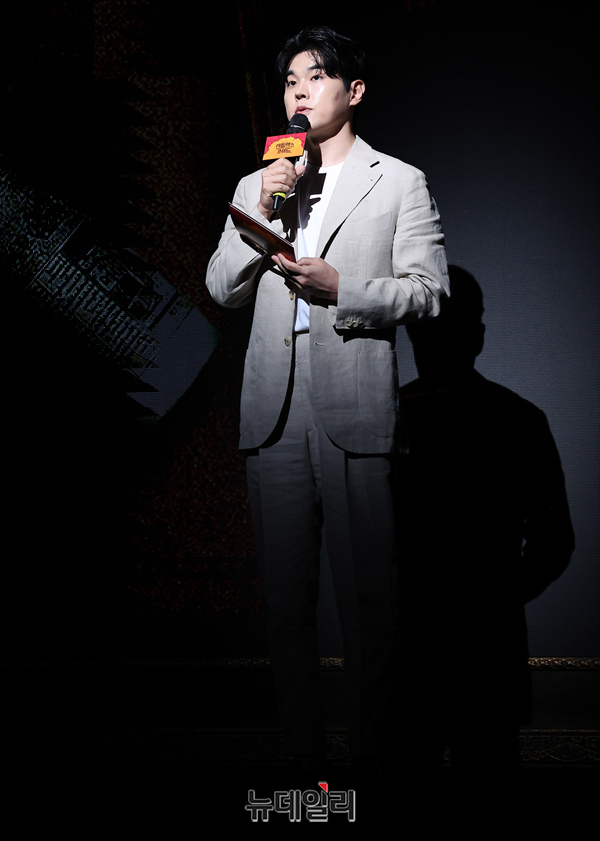 이인권 아나운서가 9일 오후 서울 강남구 광림아트센터 BBCH홀에서 열린 뮤지컬 코미디 '젠틀맨스 가이드: 사랑과 살인편' 프레스콜에서 작품 소개를 하고 있다. 뮤지컬은 7월 6일부터 10월 20일까지 BBCH홀에서 공연된다.