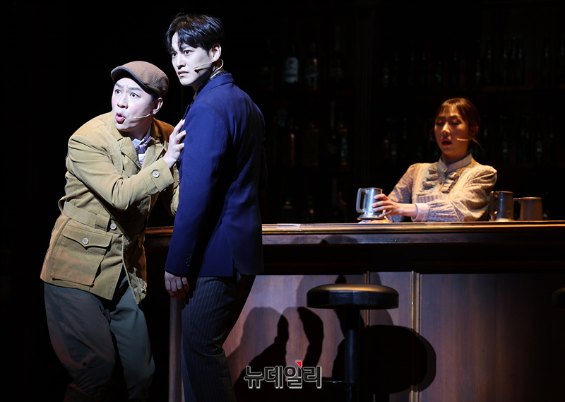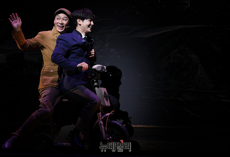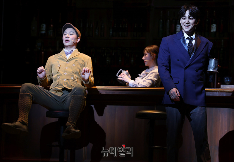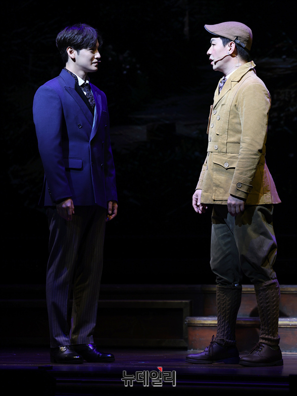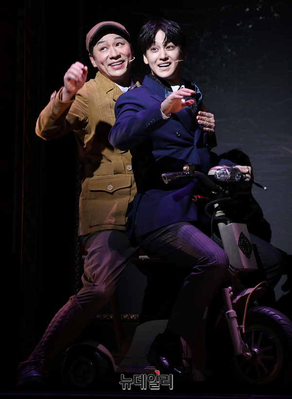 배우 정상훈과 김범이 9일 오후 서울 강남구 광림아트센터 BBCH홀에서 열린 뮤지컬 코미디 '젠틀맨스 가이드: 사랑과 살인편' 프레스콜에서 하이라이트 장면을 시연하고 있다. 뮤지컬은 7월 6일부터 10월 20일까지 BBCH홀에서 공연된다.