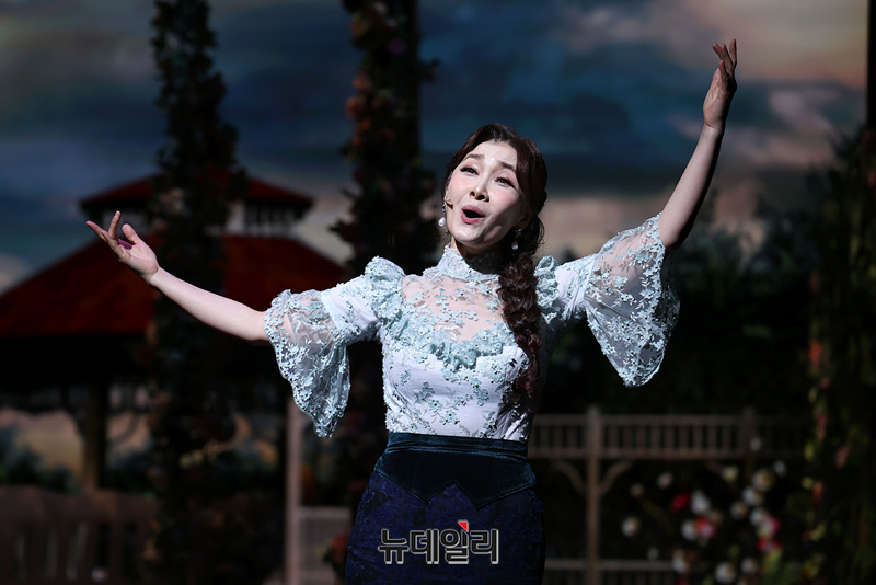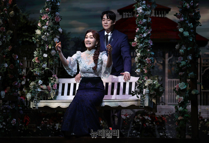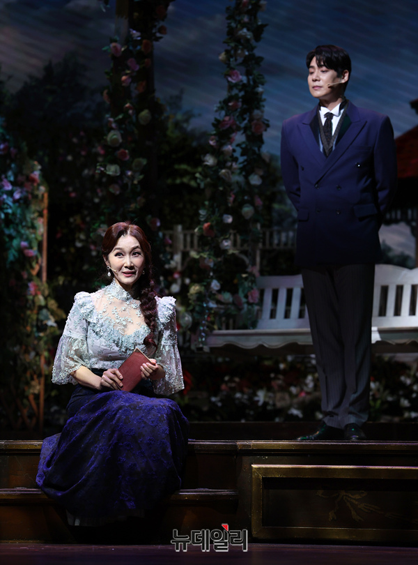 배우 김아선, 송원근이 9일 오후 서울 강남구 광림아트센터 BBCH홀에서 열린 뮤지컬 코미디 '젠틀맨스 가이드: 사랑과 살인편' 프레스콜에서 하이라이트 장면을 시연하고 있다. 뮤지컬은 7월 6일부터 10월 20일까지 BBCH홀에서 공연된다.