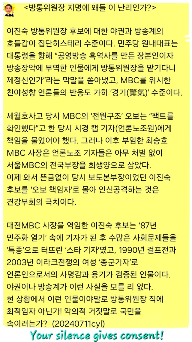 <방통위원장 지명에 왜들 이 난리인가?>이진숙 방통위원장 후보에 대한 [야권과 방송계의 호들갑] 이 집단히스테리 수준이다.박찬대 민주당 원내대표는 대통령을 향해“공영방송 흑역사를 만든 장본인이자방송장악에 부역한 인물에게 방통위원장을 맡기다니 제정신인가”라는 막말을 쏟아냈고,MBC를 위시한 친야성향 언론들의 반응도 가히 [경기(驚氣)] 수준이다.세월호사고 당시 MBC의 [전원구조] 오보는“팩트를 확인했다” 고 한 당시 시경 캡 기자(언론노조원)에게 책임을 물었어야 했다.그러나 이후 부임한 최승호 MBC 사장은언론노조 기자들은 아무 처벌 없이 서울MBC의 전국부장을 희생양으로 삼았다.이제 와서 뜬금없이당시 보도본부장이었던 이진숙 후보를[오보 책임자] 로 몰아 인신공격하는 것은 견강부회의 극치이다.대전MBC 사장을 역임한 이진숙 후보는[87년 민주화 열기] 속에 기자가 된 후수많은 사회문제들을 [특종]으로 터뜨린 [스타 기자]였고,1990년 걸프전과 2003년 이라크전쟁의여성 [종군기자]로 언론인으로서의 사명감과 용기가 검증된 인물이다.야권이나 방송계가 이런 사실을 모를 리 없다.현 상황에서 이런 인물이야말로 방통위원장 직에 최적임자 아닌가!악의적 거짓말로 국민을 속이려는가?