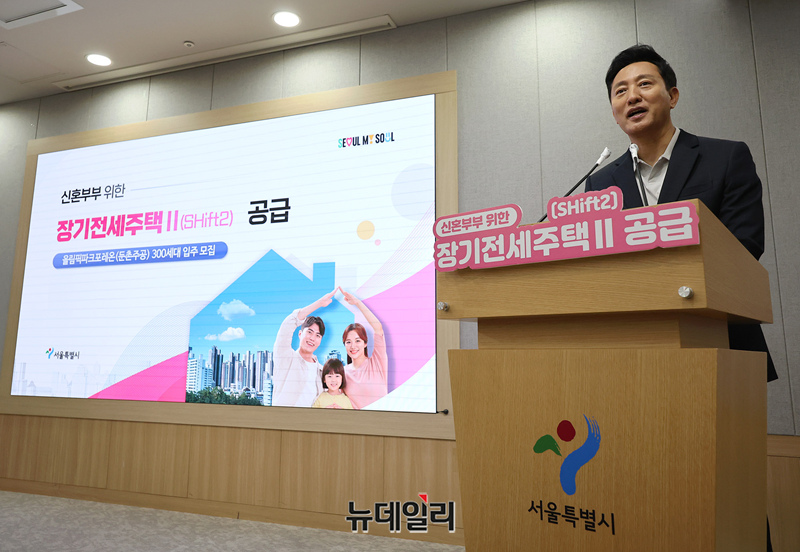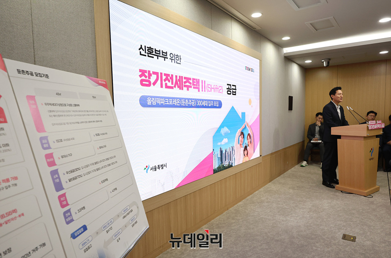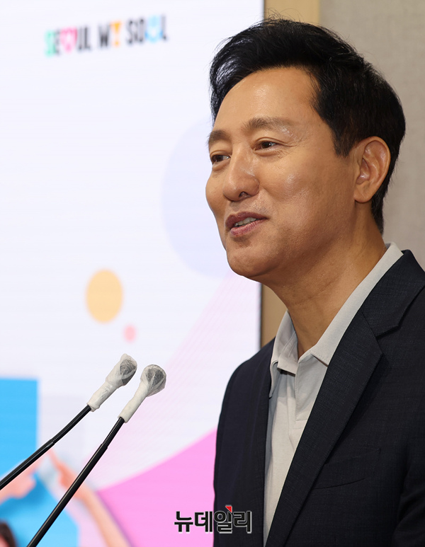 오세훈 서울시장이 10일 오후 서울시청에서 신혼부부 장기전세주택2 올림픽파크포레온(둔촌 주공) 300호 공급에 대해 약식 브리핑하고 있다.