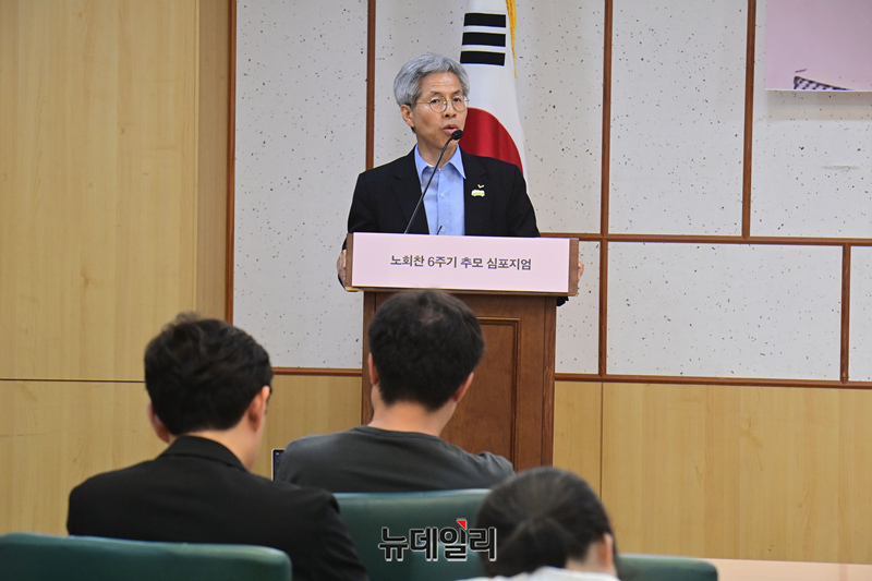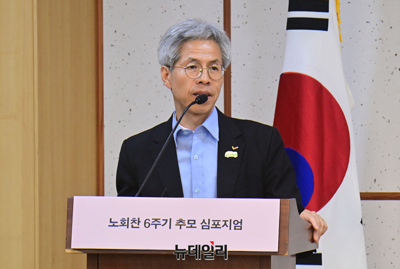 권영국 정의당 대표가 10일 오후 국회 의원회관에서 열린 노회찬 전 의원 6주기 추모 심포지엄 '한국민주주의의 질적 전환을 위한 과제'에서 추모사를 하고 있다.