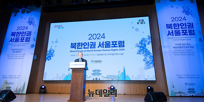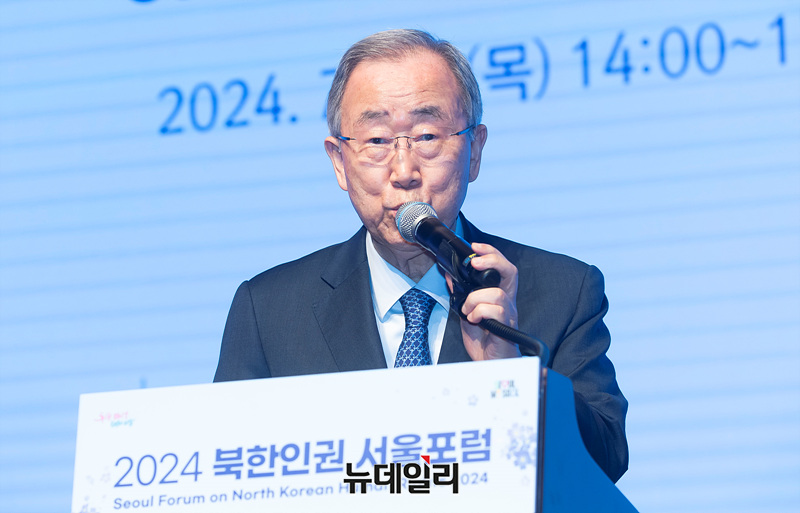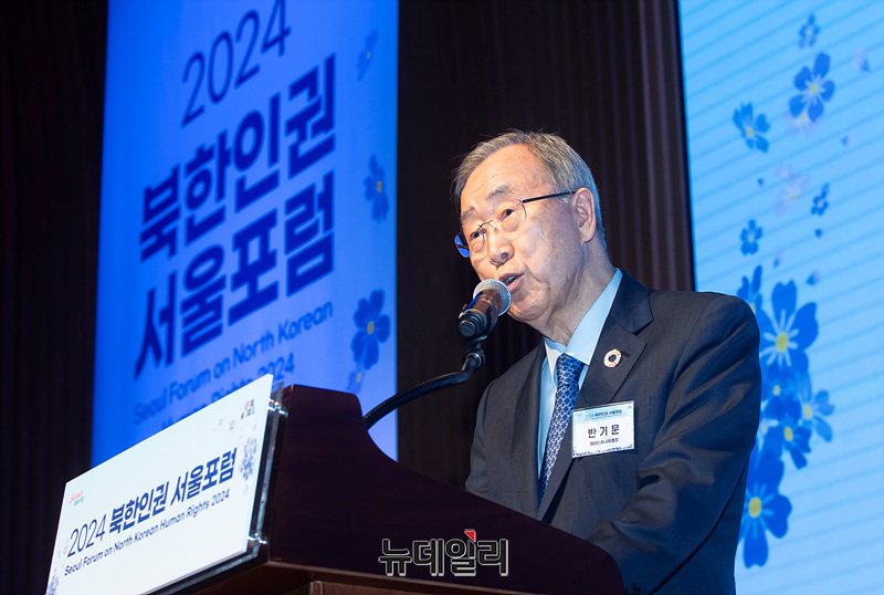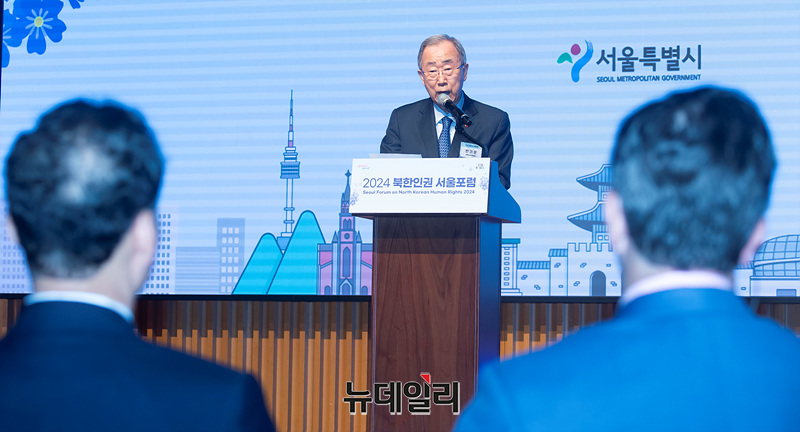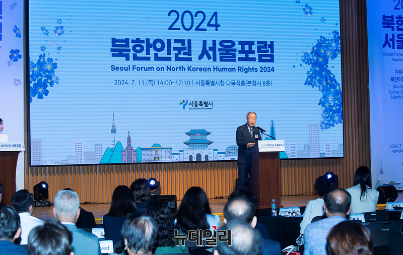 반기문 전 유엔 사무총장이 11일 오후 서울시청에서 '자유를 향한 여정, 북한이탈주민과의 동행'을 주제로 열린 '2024 북한인권 서울포럼'에서 축사를 하고 있다.이번 포럼은 북한 주민의 삶과 인권 실상을 시민들에게 알리고 북한인권을 개선하기 위한 국제사회와의 협력방안을 마련하고자 마련됐다.'북한인권 실상 및 국제협력방안'을 주제로 진행된 세션1은 이신화 북한인권국제협력대사가 좌장을, 줄리 터너 미국 국무부 북한인권특사, 엘리자베스 살몬 UN 북한인권 특별보고관, 제임스 히넌 서울 UN인권 사무소장, 브라이언 마이어스 동서대 국제학과 교수가 토론에 나섰다.'자유를 향한 여정, 북한이탈주민과의 동행'을 주제로 진행된 세션2는 남성욱 고려대 통일융합연구원장이 좌장을, 유성옥 국가안보전략연구원 이사장, 김천식 통일연구원장, 윤여상 북한인권기록보존소장, 김일혁 북한연구소 연구원이 토론에 나섰다.