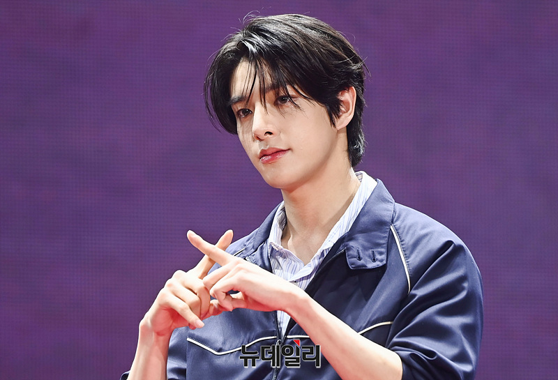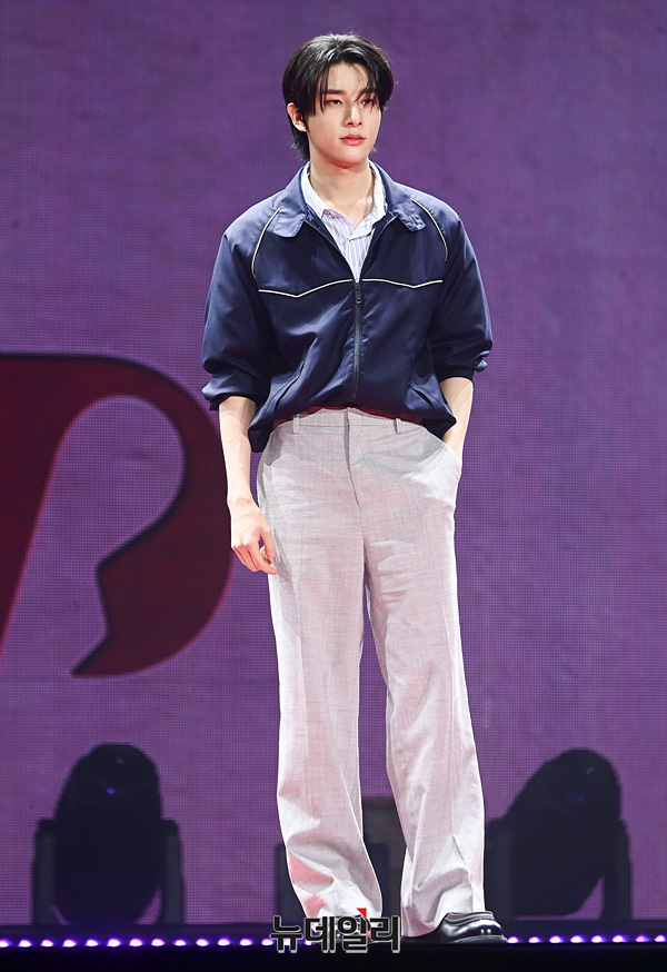 그룹 엔하이픈 제이크가 11일 오후 서울 송파구 올림픽공원 핸드볼경기장에서 열린 정규 2집 '로맨스 : 언톨드(ROMANCE : UNTOLD)' 발매 기념 쇼케이스에서 포즈를 취하고 있다.