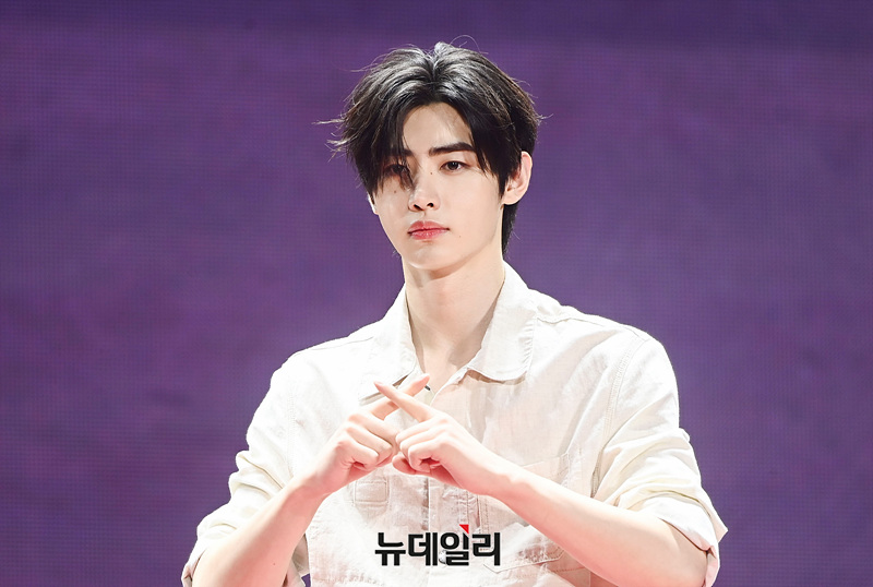 그룹 엔하이픈 성훈이 11일 오후 서울 송파구 올림픽공원 핸드볼경기장에서 열린 정규 2집 '로맨스 : 언톨드(ROMANCE : UNTOLD)' 발매 기념 쇼케이스에서 포즈를 취하고 있다.
