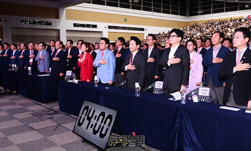 나경원, 윤상현, 원희룡, 한동훈 국민의힘 당 대표 후보가 12일 오후 대구 북구 엑스코에서 열린 '제4차 전당대회 대구·경북 합동연설회'에 참석해 자리하고 있다.