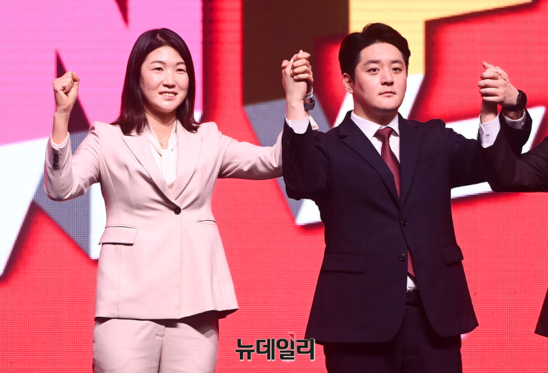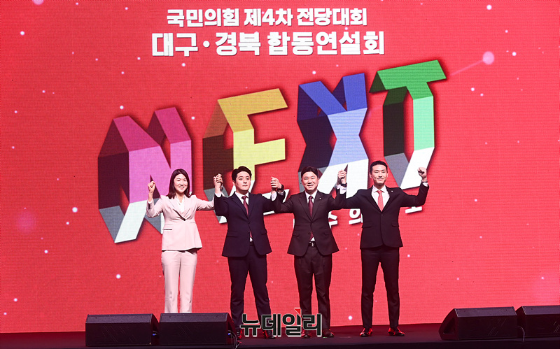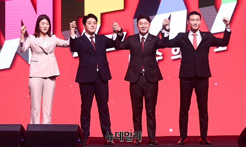 김은희, 김정식, 진종오, 박상현 국민의힘 청년최고위원 후보가 12일 오후 대구 북구 엑스코에서 열린 '제4차 전당대회 대구·경북 합동연설회'에서 정견발표를 하고 있다.