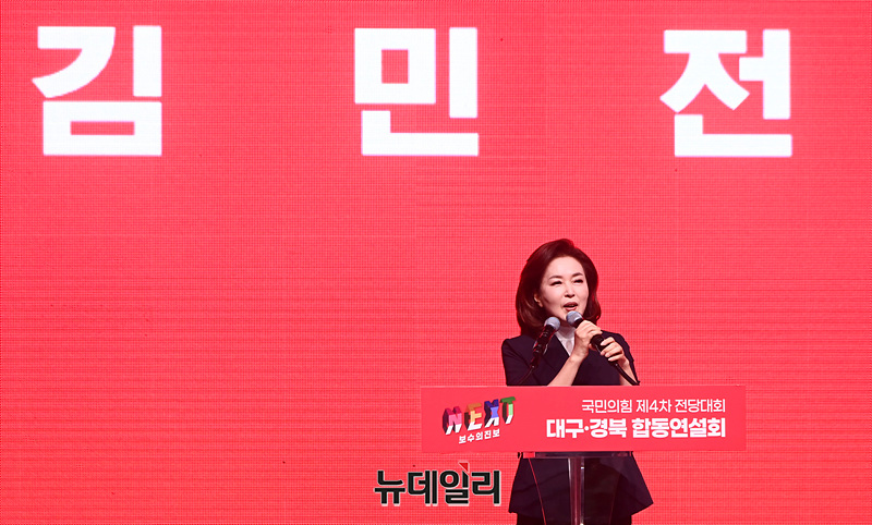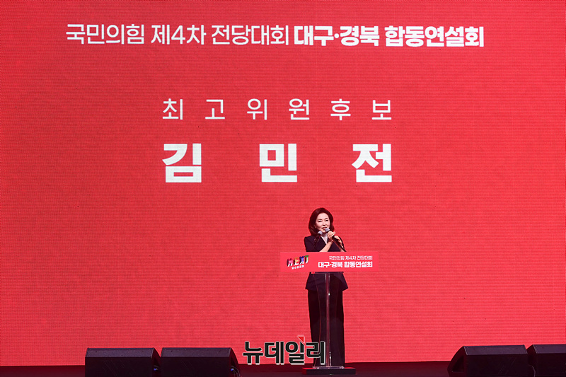 김민전 국민의힘 최고위원 후보가 12일 오후 대구 북구 엑스코에서 열린 '제4차 전당대회 대구·경북 합동연설회'에서 정견발표를 하고 있다.