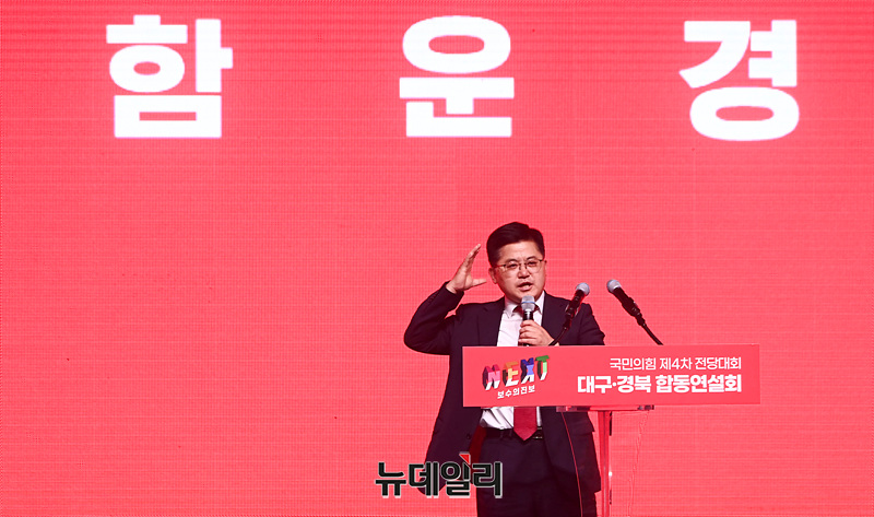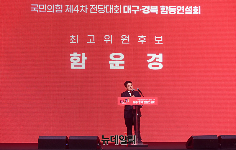 함운경 국민의힘 최고위원 후보가 12일 오후 대구 북구 엑스코에서 열린 '제4차 전당대회 대구·경북 합동연설회'에서 정견발표를 하고 있다.