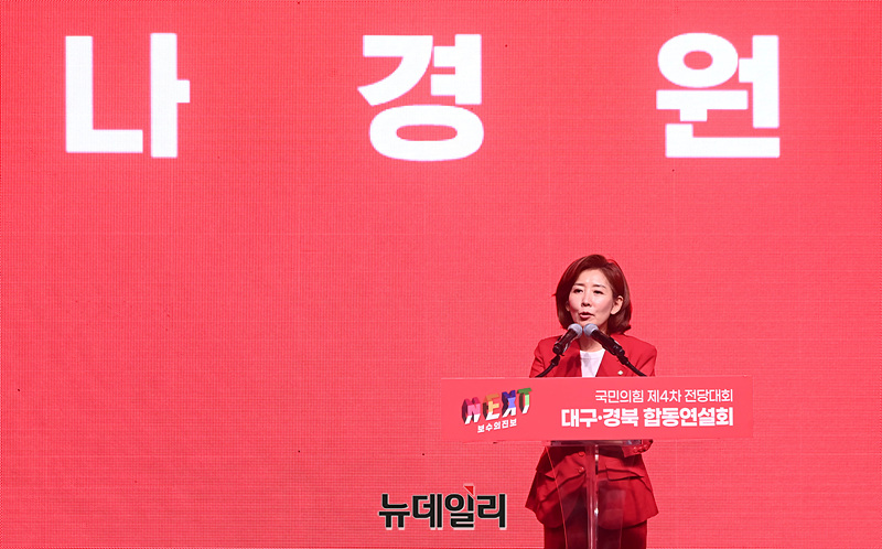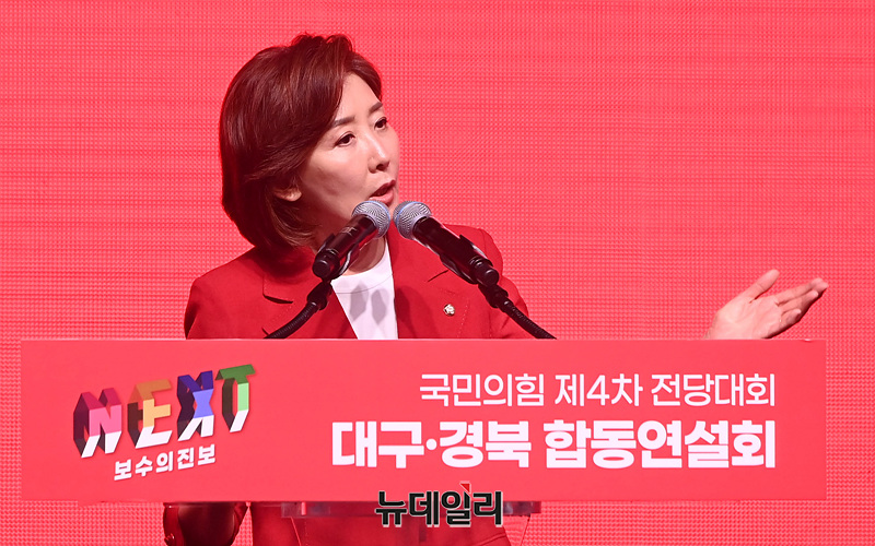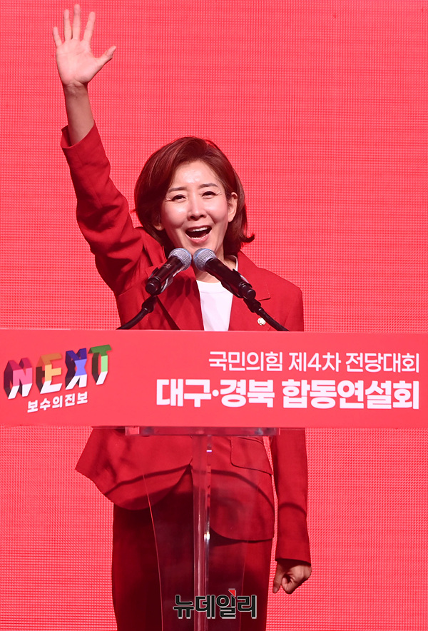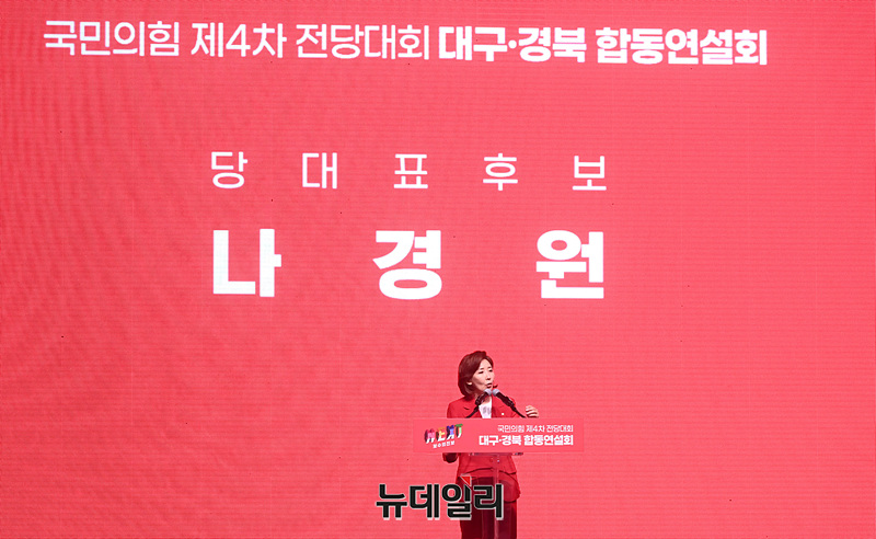 나경원 국민의힘 당 대표 후보가 12일 오후 대구 북구 엑스코에서 열린 '제4차 전당대회 대구·경북 합동연설회'에서 정견발표를 하고 있다.