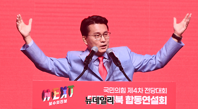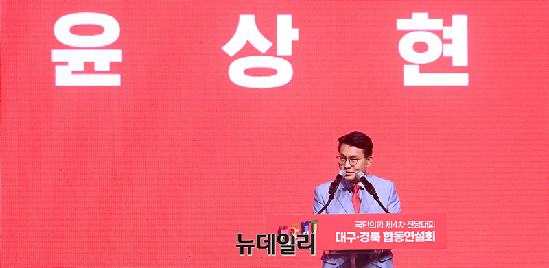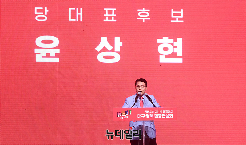 윤상현 국민의힘 당 대표 후보가 12일 오후 대구 북구 엑스코에서 열린 '제4차 전당대회 대구·경북 합동연설회'에서 정견발표를 하고 있다.
