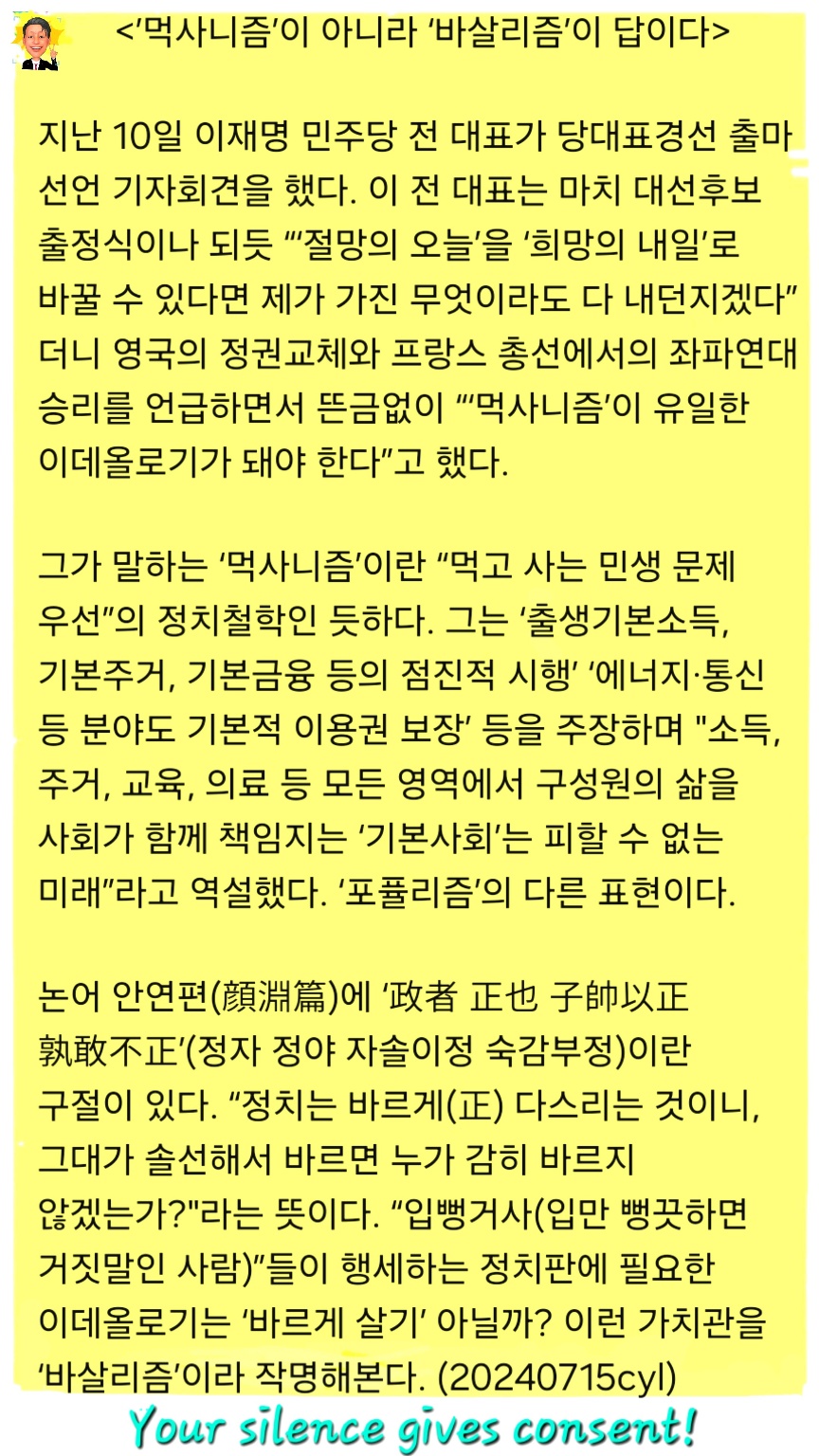< [먹사니즘]이 아니라 [바살리즘]이 답이다 >지난 10일 이재명 민주당 전 대표가 당대표경선 출마선언 기자회견을 했다.이 전 대표는 마치 대선후보 출정식이나 되듯“[절망의 오늘]을 [희망의 내일]로 바꿀 수 있다면 제가 가진 무엇이라도 다 내던지겠다” 더니영국의 정권교체와 프랑스 총선에서의 좌파연대 승리를 언급하면서 뜬금없이“[먹사니즘]이 유일한 이데올로기가 돼야 한다” 고 했다.그가 말하는 [먹사니즘] 이란 “먹고 사는 민생 문제 우선” 의 정치철학인 듯하다.그는,★ 출생기본소득, 기본주거, 기본금융 등의 점진적 시행★ 에너지·통신 등 분야도 기본적 이용권 보장 등을 주장하며"소득, 주거, 교육, 의료 등 모든 영역에서 구성원의 삶을 사회가 함께 책임지는 [기본사회]는 피할 수 없는 미래” 라고 역설했다.[포퓰리즘] 의 다른 표현이다.<논어> 안연편(顔淵篇)에[政者 正也 子帥以正 孰敢不正](정자 정야 자솔이정 숙감부정)이란 구절이 있다.“정치는 바르게(正) 다스리는 것이니, 그대가 솔선해서 바르면 누가 감히 바르지 않겠는가?"라는 뜻이다.“입뻥거사(입만 뻥끗하면 거짓말인 사람)” 들이 행세하는 정치판에 필요한 이데올로기는 [바르게 살기] 아닐까?이런 가치관을 [바살리즘]이라 작명해본다.