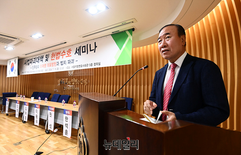 한상대 전 검찰총장이 15일 오전 서울 서초구 서울지방변호사회관에서 '민주당의 이재명 대표 방탄과 법치 파괴'를 주제로 열린 사법파괴대책 및 헌법수호 세미나에서 축사를 하고 있다.이날 세미나는 이재원 한변 회장이 환영사를, 김영훈 대한변호사협회 회장, 한상대 전 검찰총장, 문효남 사단법인 헌법을생각하는변호사모임 회장이 축사를 맡았다.이어진 토론은 권성 전 헌법재판소 재판관, 장영수 고려대학교 법학전문대학원 교수, 한석훈 연세대 겸임교수(국가인권위원회 인권위원), 문성우 전 법무부 차관, 양은경 조선일보 기자(변호사), 이용우 전 대법관이 발제 및 토론자로 나섰다.