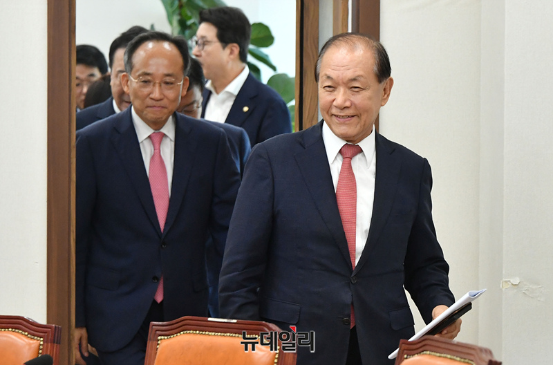 황우여 국민의힘 비상대책위원장과 추경호 원내대표가 15일 오전 국회에서 열린 비상대책위원회의에 참석하고 있다.