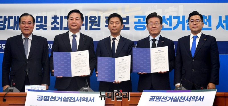 이재명·김지수·김두관 더불어민주당 당대표 후보가 15일 오전 국회에서 열린 더불어민주당 당대표 및 최고위원 후보 공명선거실천 서약식에서 서명한 후 기념촬영을 하고 있다.