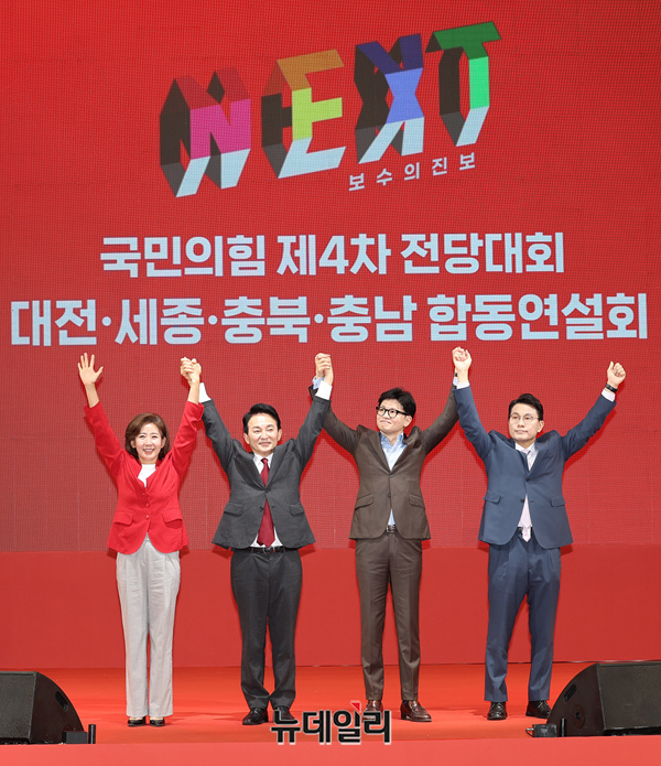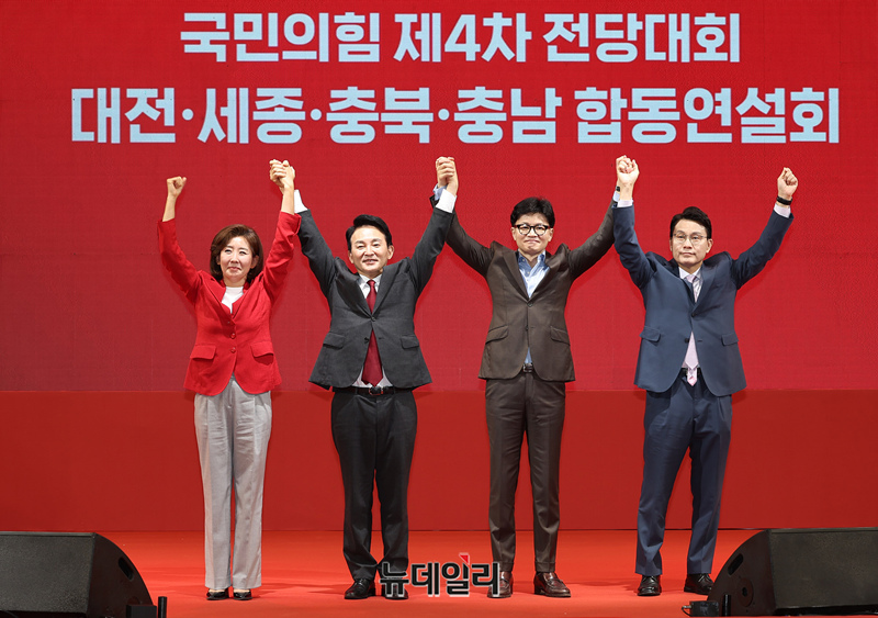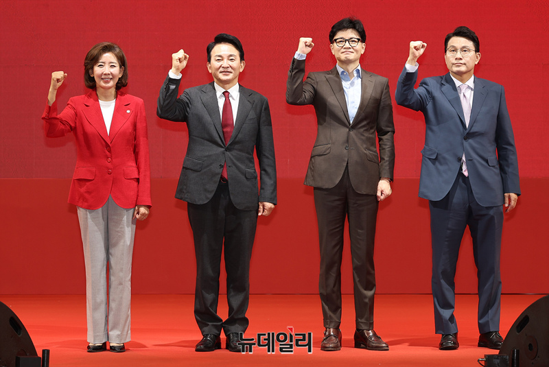나경원(왼쪽부터), 원희룡, 한동훈, 윤상현 국민의힘 당대표 후보가 15일 오후 충남 천안시 유관순체육관에서 열린 대전·세종·충북·충남 합동연설회에서 기념촬영을 하고 있다.