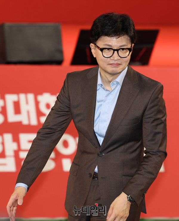 한동훈 국민의힘 당대표 후보가 15일 오후 충남 천안시 유관순체육관에서 열린 대전·세종·충북·충남 합동연설회에서 기념촬영 직후 단상을 내려오고 있다.