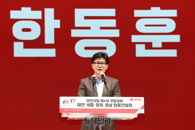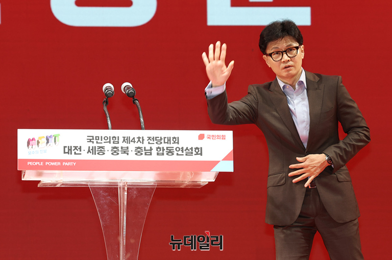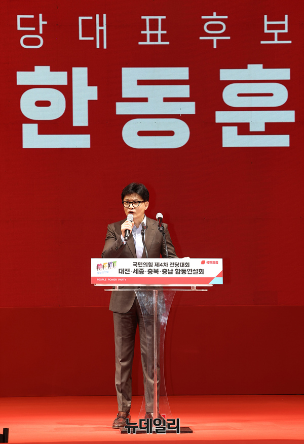 한동훈 국민의힘 당대표 후보가 15일 충남 천안시 유관순체육관에서 열린 대전·세종·충북·충남 합동연설회에서 정견발표를 하고 있다.