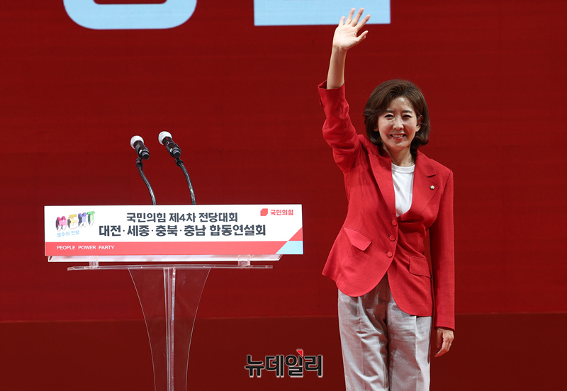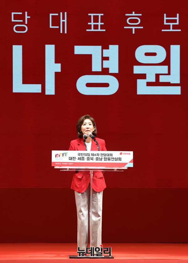 나경원 국민의힘 당대표 후보가 15일 충남 천안시 유관순체육관에서 열린 대전·세종·충북·충남 합동연설회에서 정견발표를 하고 있다.