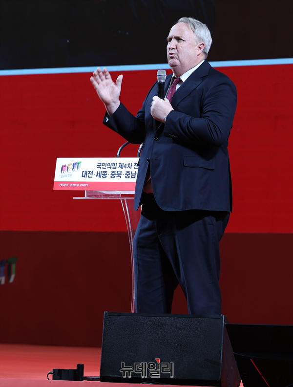 인요한 국민의힘 최고위원 후보가 15일 충남 천안시 유관순체육관에서 열린 대전·세종·충북·충남 합동연설회에서 정견발표를 하고 있다.