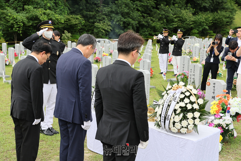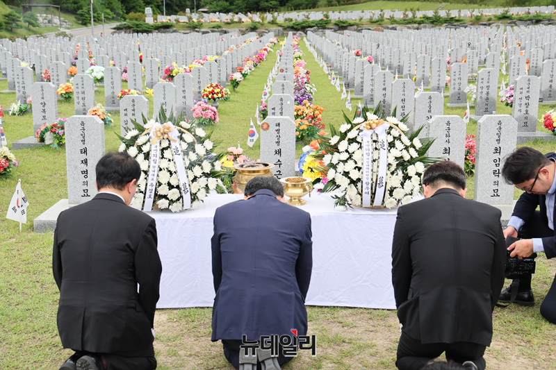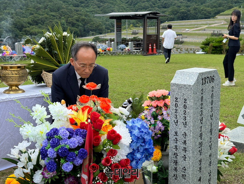 추경호 국민의힘 원내대표가 15일 오후 국립대전현충원에서 1주기를 앞두고 있는 고 채수근 상병 묘소를 참배하고 있다. (사진=국민의힘)