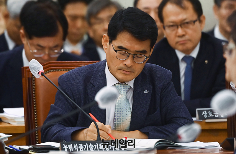 노수현 농림식품기술기획평가원장이 16일 오전 서울 여의도 국회에서 열린 농림축산식품해양수산위원회 전체회의에 출석해 의원들의 질의를 듣고 있다.