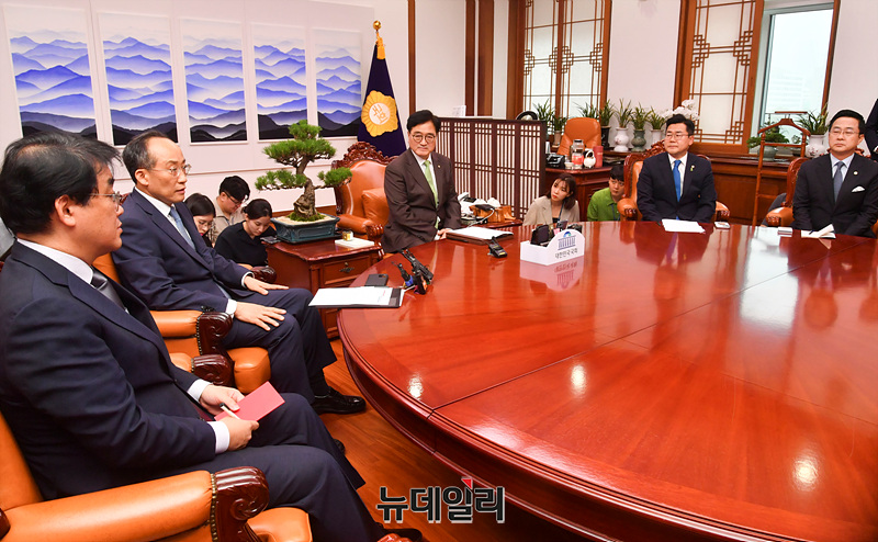 우원식 국회의장과 추경호 국민의힘 원내대표, 박찬대 더불어민주당 원내대표가 16일 오후 서울 여의도 국회 의장실에서 회동을 갖고 있다.