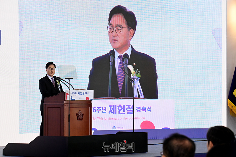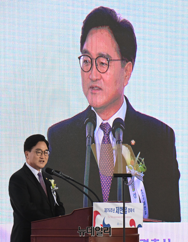 우원식 국회의장이 17일 오전 국회에서 열린 제76주년 제헌절 기념식에서 축사하고 있다. 이날 우 의장은 "22대 국회는 개헌을 성사시키는 국회가 돼야 한다"며 "여야 정당에 제안한다. 2026년 지방선거 때 개헌 국민투표를 함께하는 것을 목표로 개헌을 추진하자"고 말했다.