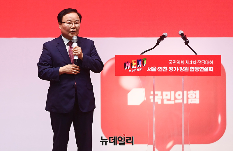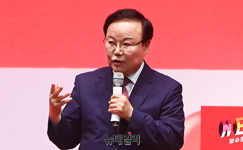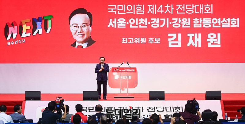 김재원 국민의힘 최고위원 후보가 17일 오후 경기 고양시 고양 소노 아레나에서 열린 '제4차 전당대회 서울·인천·경기·강원 합동연설회'에서 정견발표를 하고 있다.