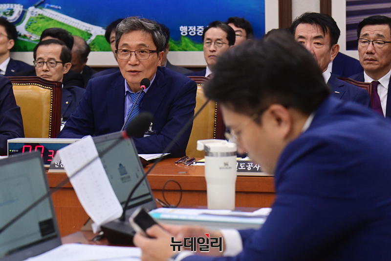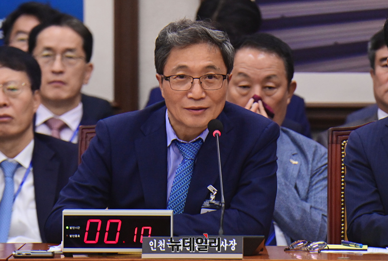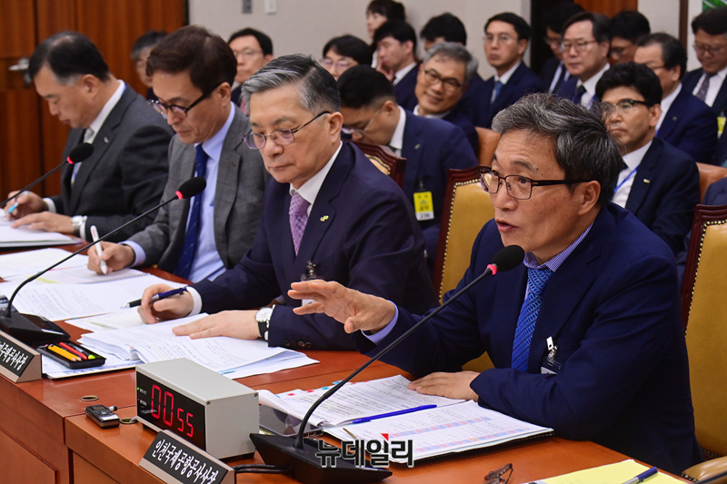 이학재 인천공항공사 사장이 17일 국회 국토교통위원회 전체회의에 출석해 의원들의 질문에 답하고 있다.
