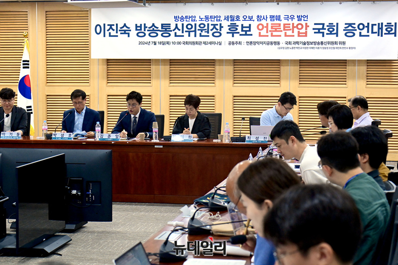 '이진숙 방송통신위원장 후보 언론탄압 국회 증언대회'가 18일 국회 의원회관에서 열리고 있다.