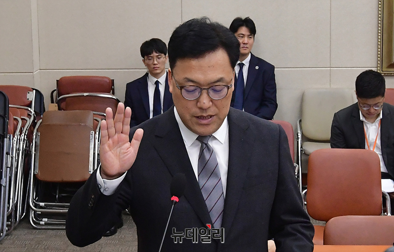 김병환 금융위원장 후보자가 22일 오전 국회에서 열린 인사청문회에서 선서를 마치고 윤한홍 정무위원장에게 선서문을 전달하고 있다.