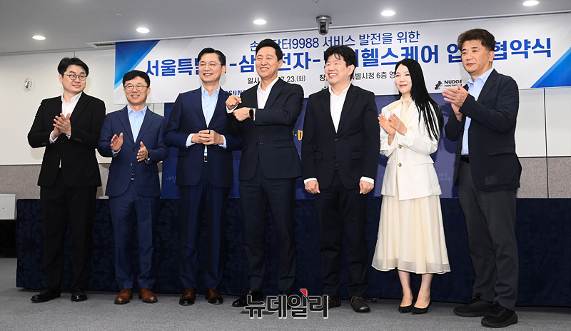 오세훈 서울특별시장, 임성택 삼성전자 부사장, 나승균 넛지헬스케어 의장이 23일 오전 서울 중구 서울시청에서 열린 '손목닥터9988 서비스 발전을 위한 서울특별시-삼성전자-넛지헬스케어 업무협약식'에서 기념촬영을 하고 있다.