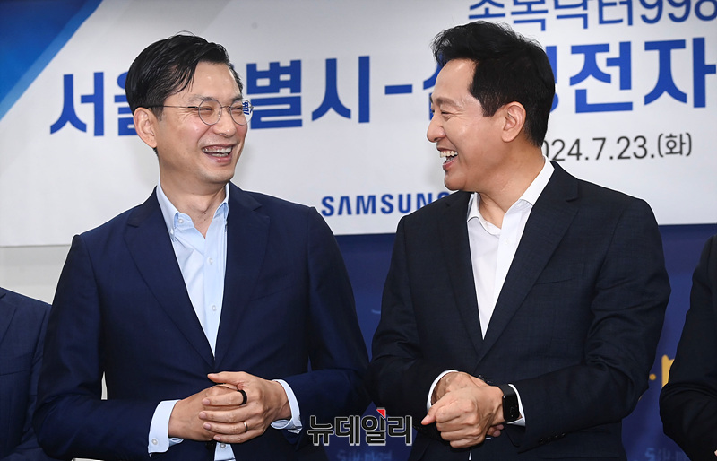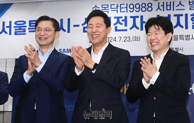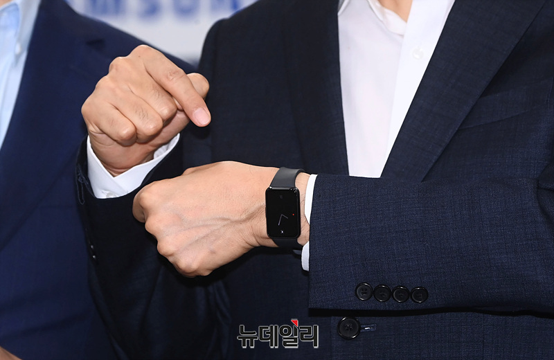 오세훈 서울특별시장이 23일 오전 서울 중구 서울시청에서 열린 '손목닥터9988 서비스 발전을 위한 서울특별시-삼성전자-넛지헬스케어 업무협약식'에서 '손목닥터'를 착용한 손목을 들어 보이고 있다.