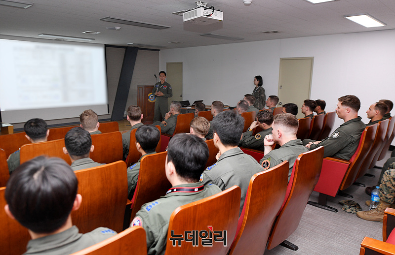 한미연합공중훈련을 위해 수원기지에 모인 韓美 조종사들이 지난 22일(월) 전체 브리핑에 임하고 있다.