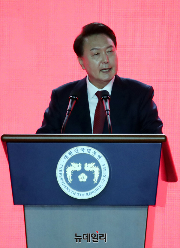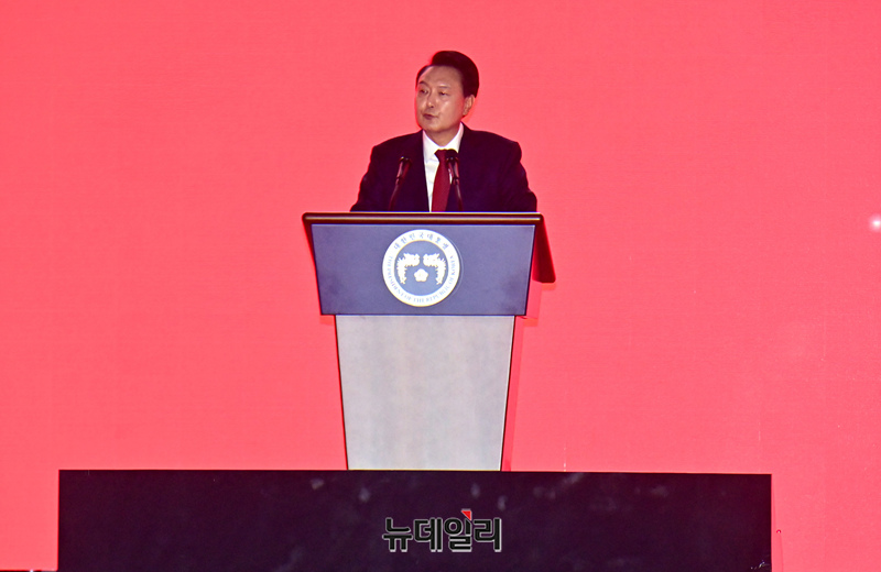 윤석열 대통령이 23일 경기 고양시 킨텍스에서 열린 제4차 국민의힘 전당대회에 참석해 축사를 하고 있다. (경기 고양=이종현 기자)