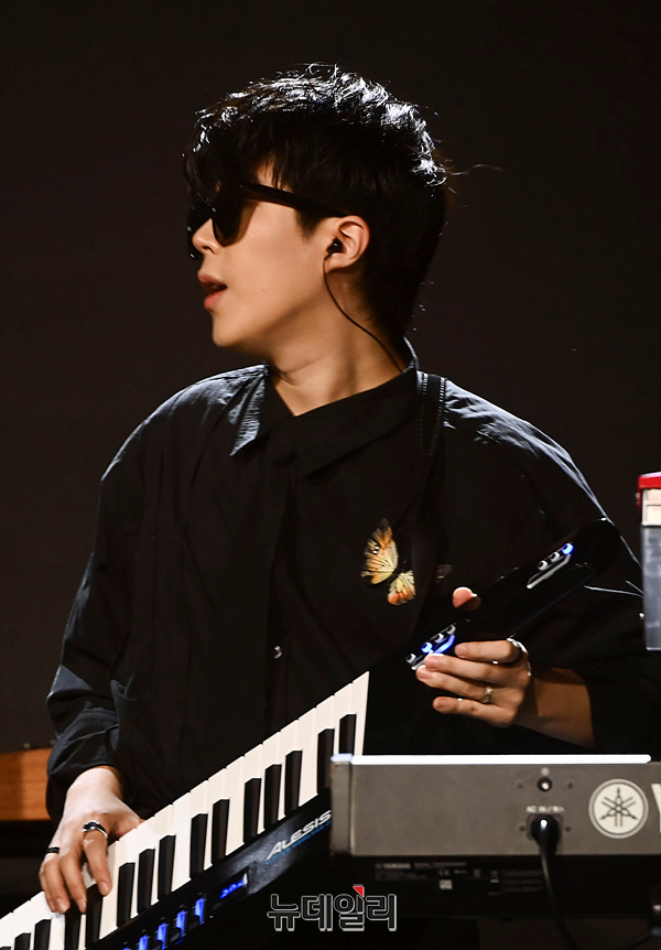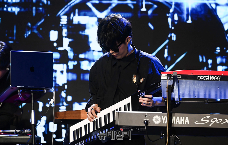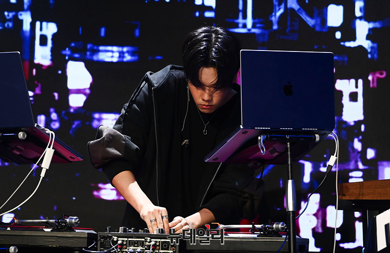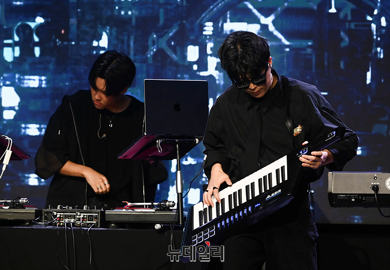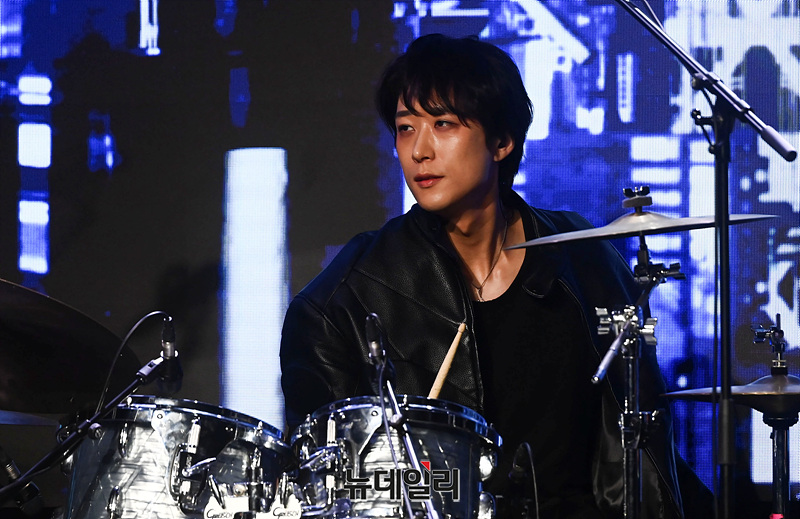 밴드 케이브(KAVE) 지상, 케키누, 가호, 오너, 현이 23일 오후 서울 마포구 무신사 개러지에서 열린 데뷔 쇼케이스에서 무대를 선보이고 있다.
