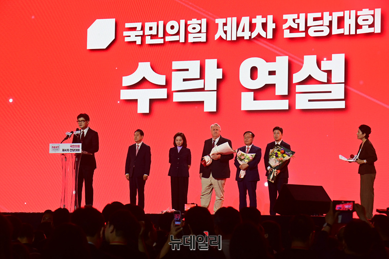 한동훈 국민의힘 신임 당 대표가 23일 경기 고양시 킨텍스에서 열린 제4차 전당대회에서 당선 후 수락연설을 하고 있다.