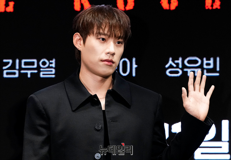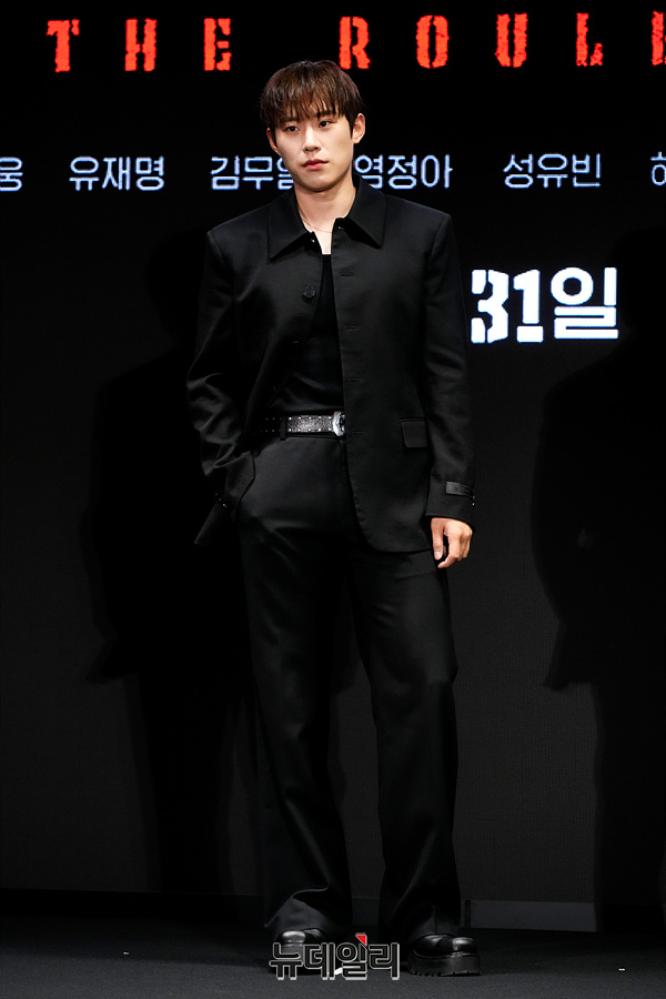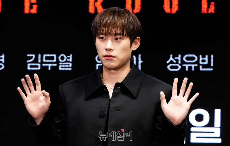 배우 김성철이 24일 오전 서울 여의도 콘래드 호텔에서 열린 디즈니 플러스 드라마 '노 웨이 아웃 : 더 룰렛' 제작발표회에서 포즈를 취하고 있다.