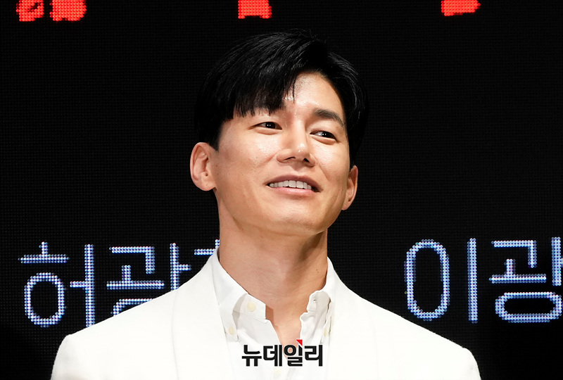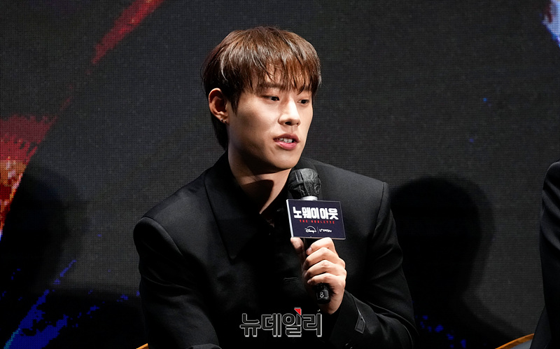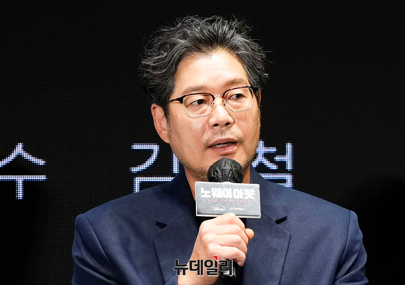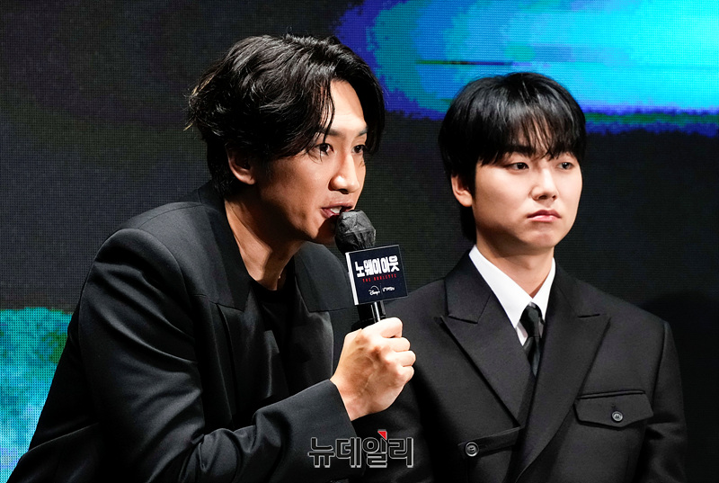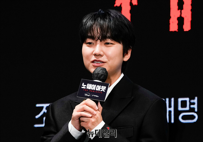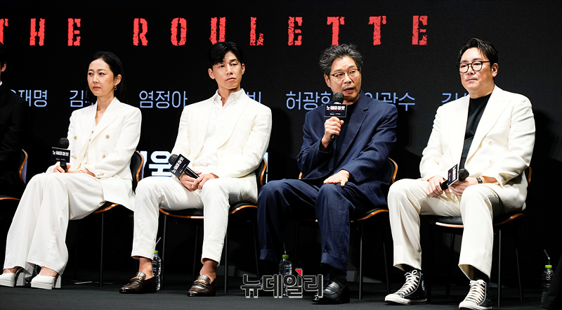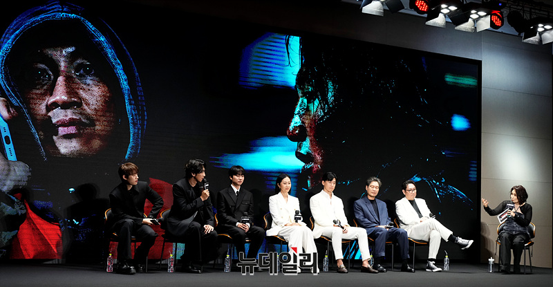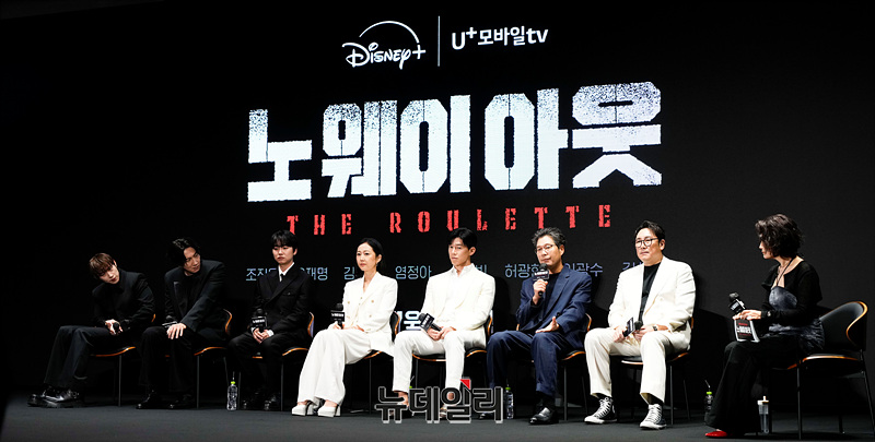 배우 조진웅, 유재명, 김무열, 염정아, 성유빈, 이광수, 김성철이 24일 오전 서울 여의도 콘래드 호텔에서 열린 디즈니+ 드라마 '노 웨이 아웃 : 더 룰렛' 제작발표회에서 드라마를 소개하고 있다.
