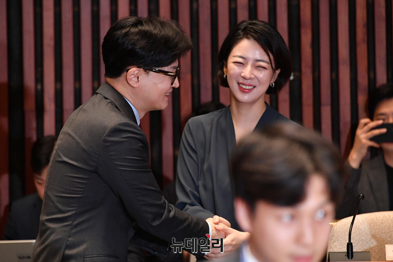 [포토] 의원들과 인사 나누는 한동훈 국민의힘 대표