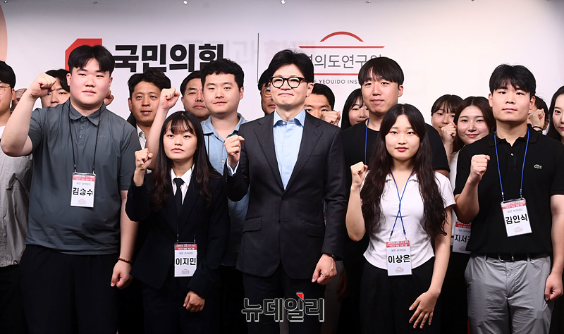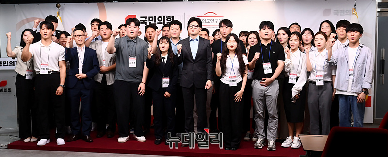 한동훈 국민의힘 대표와 참석자들이 25일 오후 서울 여의도 중앙당사에서 여의도연구원 주관으로 열린 '대한민국 미래 국가 청년 지도자 교육 프로그램'에서 기념촬영을 하고 있다.
