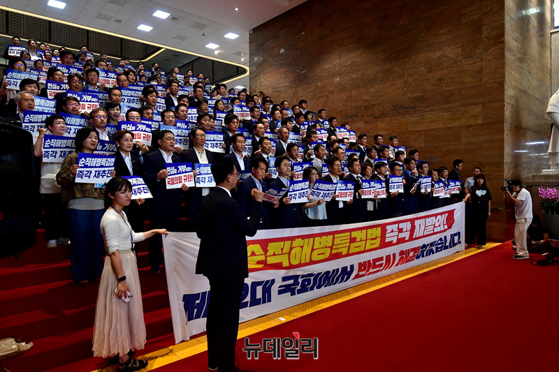 더불어민주당 및 야당 의원들이 25일 국회에서 '채상병특검법' 재의결 안건이 부결되자 로텐더홀 계단으로 나와 국민의힘을 규탄하고 있다.