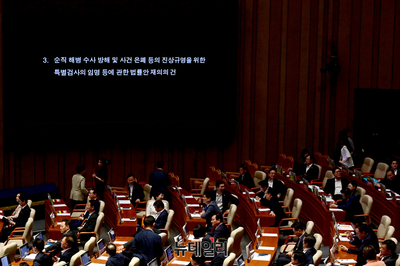채해병 특검법(순직 해병 수사 방해 및 사건 은폐 등의 진상규명을 위한 특별검사의 임명 등에 관한 법률안) 재의의 건이 5일 오후 국회에서 열린 본회의에서 총 투표수 229표 중, 가 194표, 부 104표, 무효 1표로 부결되고 있다.