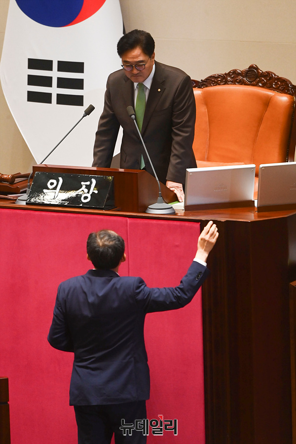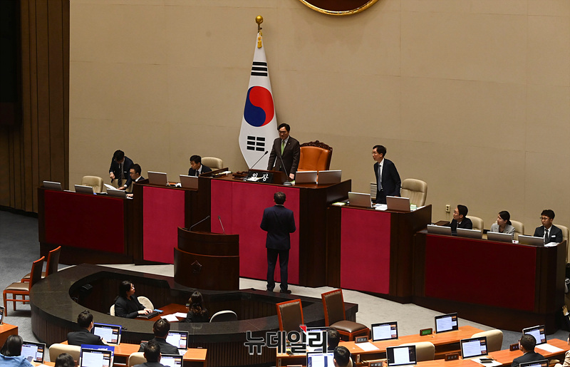 추경호 국민의힘 원내대표가 25일 오후 서울 여의도 국회에서 열린 본회의에서 안건 상정 관련해 우원식 국회의장에게 항의하고 있다.