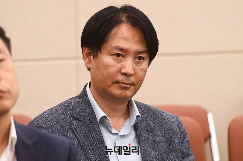 강명일 MBC노동조합 비상대책위원장이 25일 오후 서울 여의도 국회에서 열린 이진숙 방송통신위원장 후보자 인사청문회에서 출석해 자리하고 있다.