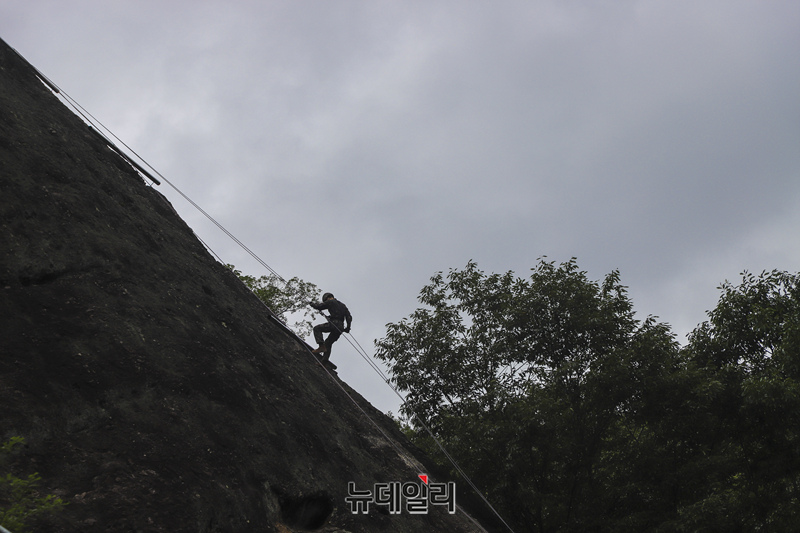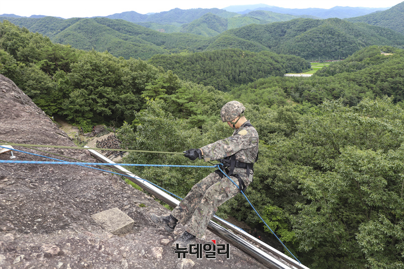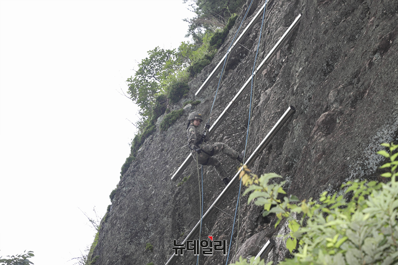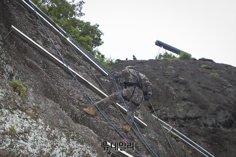 육군사관학교 2학년 생도가 25일 전남 화순군 동복유격장에서 유격훈련 중에 높이 36m 암벽에서 하강하고 있다.
