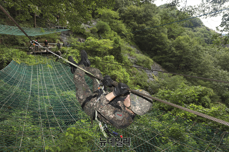 육군사관학교 2학년 생도가 25일 전남 화순군 동복유격장에서 유격훈련 중에 외줄에 의지해 횡단이동을 하고 있다.