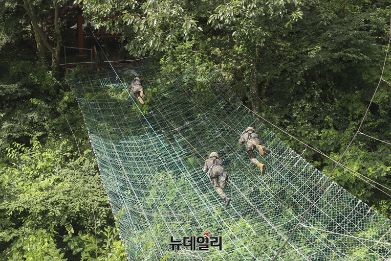 [포토] 육사 하계군사훈련, 외줄 횡단이동하는 생도들